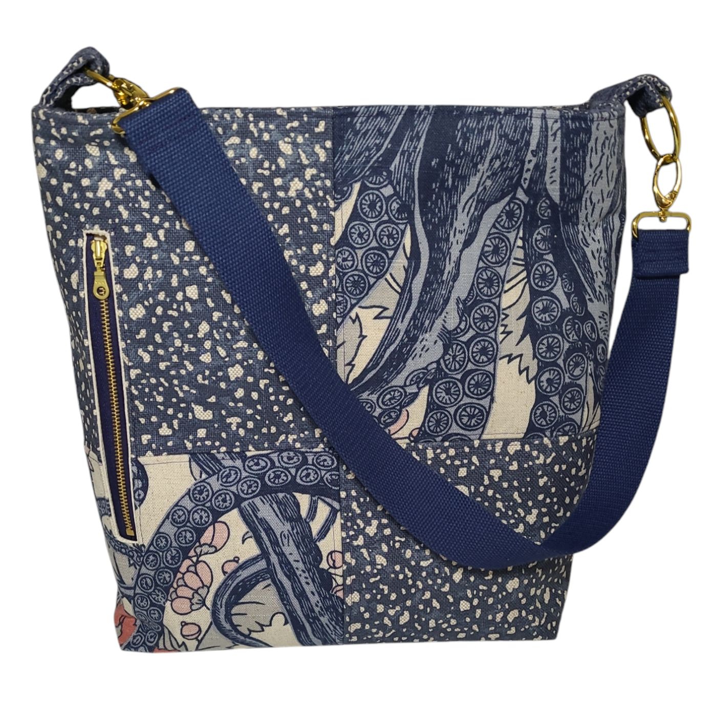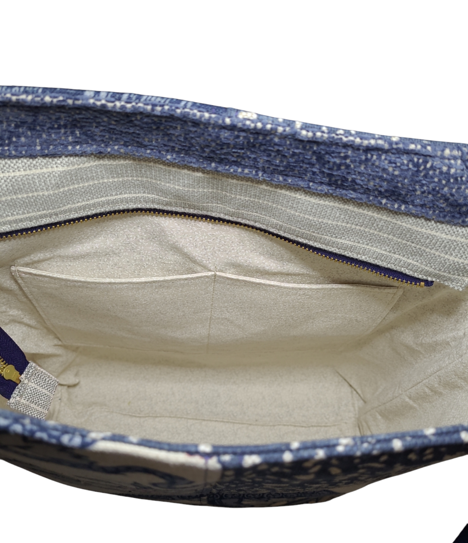 This extra-large tote includes a shoulder strap and an exterior vertical zipper perfect for your keys and cell phone. The top closure has a metal zipper. Two exterior fabrics were sewn together in a block pattern. The interior has a zipper pocket and 2 slip pockets.